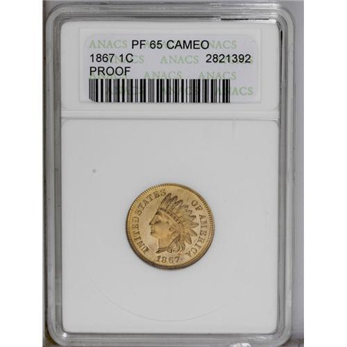 <B>1867<1C> PR65 Cameo ANACS.</B></I> A splendid cameo proof Indian cent, fully struck with highly reflective fields and nicely frosted devices. Hairline and contact-free. The 1867 is very scarce in high grades and especially with cameo contrast. Obviously, the dies were heavily polished after having been used in previous years. The obverse shows a die line prominently on the Indian's neck, a diagnostic that is seen on all proof 1867 cents. Everything that a Gem specimen should be, and more. <BR><BR><B>Important notice:</B> Heritage usually auctions material at the rate of 200-250 lots per hour. On some occasions eBay Live bid software or the Internet may not be able to keep up with the pace of the auction. We recommend placing a realistic absentee bid now as insurance to avoid disappointment. Occasionally the auctioneer may eliminate or reject an eBay Live bid, and the auctioneer may also reopen a lot after the close of the eBay live bidding (usually because we missed an audience bid), and may reject your bid even if it shows you as the winning bidder. By bidding via eBay Live, you agree that Heritage may award the lot to another bidder at its sole discretion under the circumstances described above or any other reasonable circumstances. Since eBay bids are not shown to us until we open the lot on the floor, we treat those bids just like floor bids. In most cases the floor responds before the eBay bid is presented to us, due to Internet lag time, so for consistency we have made it a policy that floor bids are always considered first over tie eBay live bids. Also please note that all Heritage lots purchased through eBay Live carry a 20% Buyer's Premium. Please make sure you read the Terms and Conditions before you bid. This lot is being auctioned in conjunction with a live floor auction by Heritage Galleries & Auctioneers. All final auction and invoice information will be supplied by Heritage Galleries & Auctioneers, and all other information should be considered preliminary. Lot:438 <BR><BR><B>Winning Notification and Billing:</B> After the FINAL session in this auction is complete, Heritage will send e-mail and snail mail invoices. This process normally takes several days. All final auction and invoice information will be supplied by Heritage Galleries & Auctioneers, and all other information should be considered preliminary. <BR><BR>This auction will be conducted on a live auction floor and over the Internet through eBay Live. If you choose to place an absentee bid, please take a moment to <font color='#0000ff'><u><a href='http://pages.ebay.com/liveauctions/help/before/laabsentee.html'>learn how eBay Live absentee bidding works</a></u></font><font color='#000000'>