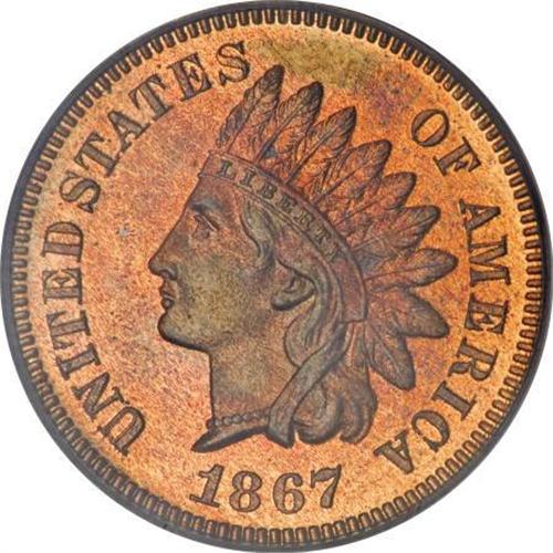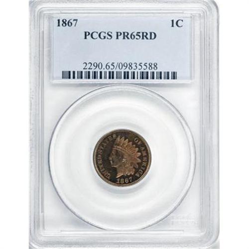 <B>1867 1C PR65 Red PCGS.</B></I> A tiny die chip in the hair just above Liberty's ear is diagnostic of genuine proof strikings from this date. Sharply struck with profoundly reflective fields and appealing shades of amber, gold, and steel-green across both sides. Conditionally scarce with few specimens known any finer. Population: 12 in 65 Red, 0 finer (10/07). <BR><BR><B>Coin Engraver:</B> James B. Longacre<BR><BR><b>Shipping:</b> Coins & Currency (<a target="_blank" href="http://www.heritageauctions.com/common/shipping.php">view shipping information</a>)