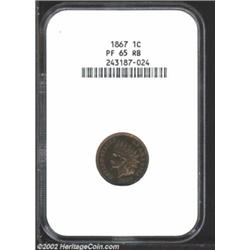 1867 1C PR65 Red and Brown NGC. Glassy, needle sharp surfaces have faded to a natural golden-violet color that is quite attractive, with bluish-green accents touching the highest points of the obverse. A rock solid Gem of this more difficult early proof issue. Population: 27 in 65, 9 finer (10/02).From the Ohio Collection. Important notice: We expect to be auctioning lots at the rate of 200-250 per hour. Sometimes eBay Premier live bid software cannot keep up with that pace, so we strongly recommend that you place a realistic proxy bid now as insurance to avoid disappointment. Also please note that all Heritage/CAA lots purchased through eBay Premier carry a 20% Buyer's Premium. Please make sure you read the Terms and Conditions.