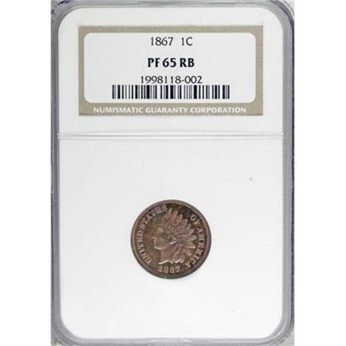 <B>1867 1C PR65 Red and Brown NGC.</B></I> Deeply toned in layers of fire-red, sunset-orange, and royal-blue over both sides. This outstanding Gem proof specimen is fully struck on all of the design elements. Contact marks are nonexistent, and carbon specks are minimal in number. Census: 38 in 65 Red and Brown, 9 finer (7/07). <BR><BR><B>Coin Engraver:</B> James B. Longacre<BR><BR><b>Shipping:</b> Coins & Currency (<a target="_blank" href="http://www.heritageauctions.com/common/shipping.php">view shipping information</a>)