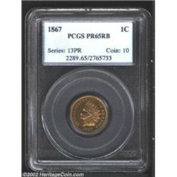 1867 1C PR65 Red and Brown PCGS. The obverse is fully lustrous with rich reddish-orange color. The r