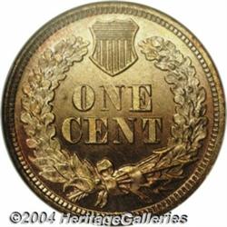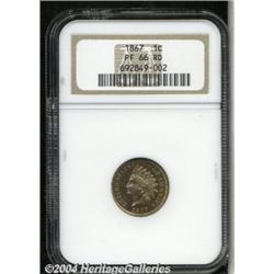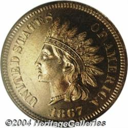 <B>1867<1C> PR66 Red NGC.</B></I> The 1867 is a low mintage issue, and very scarce in high grade with full red color. This example is brightly reflective, with light copper-gold surfaces. The design elements are exquisitely struck. A small, well concealed mark is located to the right of the Indian's ear. Population: 5 in 66, 0 finer (6/04). <BR><BR><B>Important notice:</B> Heritage usually auctions material at the rate of 200-250 lots per hour. On some occasions eBay Live bid software or the Internet may not be able to keep up with the pace of the auction. We recommend placing a realistic absentee bid now as insurance to avoid disappointment. Occasionally the auctioneer may eliminate or reject an eBay Live bid, and the auctioneer may also reopen a lot after the close of the eBay live bidding (usually because we missed an audience bid), and may reject your bid even if it shows you as the winning bidder. By bidding via eBay Live, you agree that Heritage may award the lot to another bidder at its sole discretion under the circumstances described above or any other reasonable circumstances. Since eBay bids are not shown to us until we open the lot on the floor, we treat those bids just like floor bids. In most cases the floor responds before the eBay bid is presented to us, due to Internet lag time, so for consistency we have made it a policy that floor bids are always considered first over tie eBay live bids. Also please note that all Heritage lots purchased through eBay Live carry a 20% Buyer's Premium. Please make sure you read the Terms and Conditions before you bid. </span></font></tr></table></td></tr></table>
