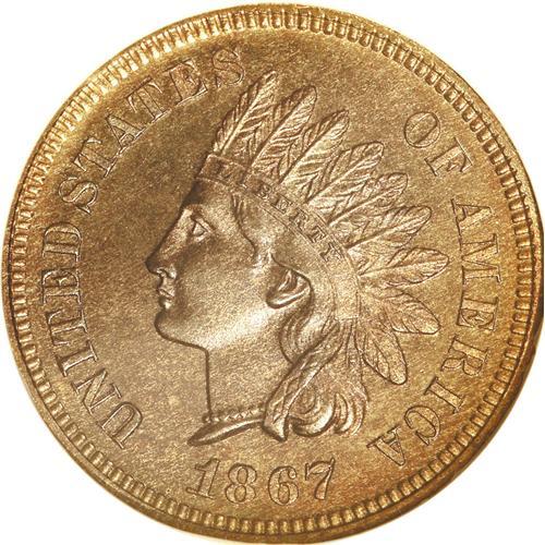 <B>1867<1C> PR66 Red and Brown NGC.</B></I> With no distracting carbon flecks or contact marks, this coin is comfortably at home at the Premium Gem grade level. There is an attractive mix of lilac, golden-brown, and red-gold patina over both sides. The strike is razor-sharp, even on the feather tips of the headdress, and the fields exhibit substantial glassy reflectivity. Census: 9 in 66, 0 finer (7/06).<BR><I>From The Tigard Oregon Small Cent Collection.</B></I>