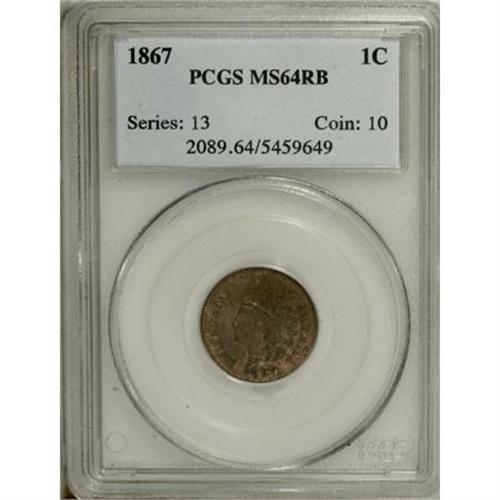 <B>1867 1C MS64 Red and Brown PCGS.</B></I> PCGS Population (183/39). NGC Census: (119/123). Mintage: 9,821,000. Numismedia Wsl. Price for NGC/PCGS coin in MS64: $525. (#2089)<BR><BR><B>Coin Engraver:</B> James B. Longacre<BR><BR><b>Shipping:</b> Coins & Currency (<a target="_blank" href="http://www.heritageauctions.com/common/shipping.php">view shipping information</a>)