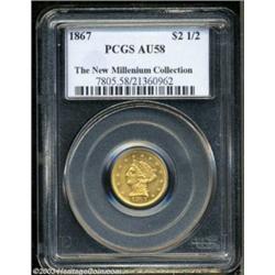 <table><tr><td><TABLE cellSpacing=0 cellPadding=0 width="100%" bgColor=#000000 border=0><TBODY> <TR><TD width="100%"><TABLE cellSpacing=1 cellPadding=3 width="100%" border=0><TBODY><TR><TD width="100%" bgColor=#79735c><FONT face=arial color=#ffffff size=3><B>Description</B> </FONT></TD></TR><TR><TD width="100%" bgColor=#ffffff><FONT face=arial size=2><B>1867 $2 1/2 AU58 PCGS.</B></I> Only 3,200 business strikes were coined this year. Some reflective mint luster remains hidden in the devices on this conditionally scarce issue. Well struck throughout.<BR><I>From The New Millennium Collection.</B></I> </FONT></TD></TR></TBODY></TABLE></TD></TR></TBODY></TABLE><BR><A name=PricesRealized></A><TABLE cellSpacing=0 cellPadding=0 width="100%" bgColor=#000000 border=0><TBODY><TR><TD width="100%"><TABLE cellSpacing=1 cellPadding=3 width="100%" border=0><TBODY><TR><TD width="100%" bgColor=#79735c><A name=PR><FONT face=arial color=#ffffff size=3><B>Previous Prices from Heritage Auctions</B> </FONT></A></TD></TR><TR><TD bgColor=#f6f6ed><TABLE cellSpacing=0 cellPadding=0 width="100%" border=1><TBODY><TR><TD align=middle width="33%"><B>Date</B></TD><TD align=middle width="33%"><B>Service</B></TD><TD align=middle width="33%"><B>Price</B></TD></TR><TR bgColor=whitesmoke><TD width="33%"><B>01/10/1998</B></TD><TD width="33%">NGC</TD><TD width="33%">$2,070.00</TD></TR></TBODY></TABLE></TD></TR><TR><TD bgColor=#ffffff><FONT face=arial size=1 ?>PLEASE NOTE: All prices realized reflect the final hammer price PLUS the buyer's premium in auctions that charge a buyer's premium. Each item has a notation at the top of the listing indicating whether that lot included a buyer's premium. Example: A item that sells with a final hammer price of $100 and a 20% buyer's premium will display with a price realized of $120. All information listed is intended to be as accurate as possible, but errors are possible. Please use this guide carefully and inform us of any inaccuracies. </FONT></TD></TR></TBODY></TABLE></TD></TR></TBODY></TABLE><BR><TABLE cellSpacing=0 cellPadding=0 width="100%" bgColor=#000000 border=0><TBODY><TR><TD width="100%"><TABLE cellSpacing=1 cellPadding=3 width="100%" border=0><TBODY><TR><TD width="100%" bgColor=#79735c colSpan=6><FONT face=arial color=#ffffff size=3><B>Price Guide*</B> </FONT></TD></TR><TR bgColor=#f6f6ed><TD align=middle><B>Grade</B> </TD><TD align=middle><B>Coin World<BR>(Trends)</B> </TD><TD align=middle><B>Numismedia<BR>Retail</B> </TD><TD align=middle><B>Numismedia<BR>Wholesale</B> </TD><TD align=middle><B>Coin<BR>Universe</B> </TD><TD align=middle><B>Heritage<BR>Value Index</B> </TD></TR><TR bgColor=#ffffff><TD align=middle>55</TD><TD align=right>$1,800.00</TD><TD align=right>---</TD><TD align=right>$1,675.00</TD><TD align=right>$1,500.00</TD><TD align=right>$1,493.75</TD></TR><TR style="FONT-WEIGHT: bold" bgColor=#cccfdd><TD align=middle>58</TD><TD align=right>$2,650.00</TD><TD align=right>---</TD><TD align=right>$2,425.00</TD><TD align=right>---</TD><TD align=right>$2,519.83</TD></TR><TR bgColor=#ffffff><TD align=middle>60</TD><TD align=right>$3,600.00</TD><TD align=right>---</TD><TD align=right>$3,450.00</TD><TD align=right>$5,500.00</TD><TD align=right>$3,293.33</TD></TR><TR bgColor=#ffffff><TD colSpan=6><FONT size=1>*All information listed is intended to be as accurate as possible, but errors are possible. No item may be returned or refused based on this information which is provided as a service to our customers. You should contact each pricing source directly to determine the accuracy of this information. </FONT></TD></TR></TBODY></TABLE></TD></TR></TBODY></TABLE><BR><TABLE cellSpacing=0 cellPadding=0 width="100%" bgColor=#000000 border=0><TBODY><TR><TD width="100%"><TABLE cellSpacing=1 cellPadding=3 width="100%" border=0><TBODY><TR><TD width="100%" bgColor=#79735c><FONT face=arial color=#ffffff size=3><B>Population Guide</B> </FONT></TD></TR><TR bgColor=#ffffff><TD align=middle><!-- Begin Output of Population Grid--><TABLE cellSpacing=0 cellPadding=0 width="100%" border=0><TBODY><TR><TD vAlign=center><TABLE cellSpacing=0 width="100%" border=1 cellsadding="3"><TBODY><TR><TD vAlign=center><TABLE cellSpacing=0 cellPadding=3 width="100%" border=1><TBODY><TR><TD vAlign=center align=middle bgColor=#f0f1e8 colSpan=2 <CENTER><FONT face=Arial size=2><B>PCGS Pop </B></FONT><CENTER></CENTER></TD><TD vAlign=center align=middle bgColor=#f0f1e8 colSpan=2><CENTER><FONT face=Arial size=2><B>NGC Pop</B></CENTER></FONT></TD></TR><TR><TD vAlign=center><FONT face=Arial size=2>(58)</FONT> </TD><TD vAlign=center align=right><FONT face=Arial size=2>1</FONT> </TD><TD vAlign=center><FONT face=Arial size=2>(58)</FONT> </TD><TD vAlign=center align=right><FONT face=Arial size=2>6</FONT> </TD></TR><TR><TD vAlign=center><FONT face=Arial size=2>(>58)</FONT> </TD><TD vAlign=center align=right><FONT face=Arial size=2>5</FONT> </TD><TD vAlign=center><FONT face=Arial size=2>(>58)</FONT> </TD><TD vAlign=center align=right><FONT face=Arial size=2>6</FONT> </TD></TR></TBODY></TABLE></TD></TR></TBODY></TABLE></TD></TR></TBODY></TABLE><!-- End Output of Population Grid--></TD></TR></TBODY></TABLE></TD></TR></TBODY></TABLE><BR><TABLE cellSpacing=0 cellPadding=0 width="100%" bgColor=#000000 border=0><TBODY><TR> Important notice: Heritage usually auctions material at the rate of 200-250 lots per hour. On some occasions eBay Live bid software or the Internet may not be able to keep up with the pace of the auction. We recommend placing a realistic absentee bid now as insurance to avoid disappointment. Occasionally the auctioneer may eliminate or reject an eBay Live bid, and the auctioneer may also reopen a lot after the close of the eBay live bidding (usually because we missed an audience bid), and may reject your bid even if it shows you as the winning bidder. By bidding via eBay Live, you agree that Heritage may award the lot to another bidder at its sole discretion under the circumstances described above or any other 