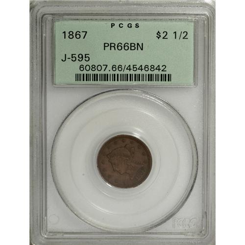 <B>1867 $2.50 Liberty Head Quarter Eagle, Judd-595, Pollock-659, R.7, PR66 Brown PCGS.</B></I> The regular issue design for the 1867 Liberty Head quarter eagle. Struck in copper with a reeded edge. This is another entry in the lineup of copper "trial pieces" for the 1867 coinage, produced solely as an addition to the Mint's rare coin inventory for sale to collectors. The Mint was the only "coin dealer" that could actually manufacture their own inventory. This example has a sharp strike and subdued olive-brown surfaces. A few tiny green specks are evident on each side. Various sources give different estimates of rarity, ranging from R.8 to Low R.7. Probably half a dozen examples survive today.<BR><I>From The Jones Beach Collection.</B></I><BR><BR><b>Shipping:</b> Coin/Currency (<a target="_blank" href="http://www.heritageauctions.com/common/shipping.php">view shipping information</a>)