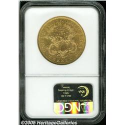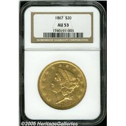 <B>1867 $20 AU53 NGC.</B></I> Typically but not unduly marked, this lightly circulated piece retains ample luster throughout protected areas.