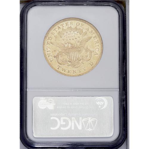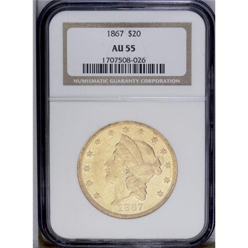 <B>1867<$20> AU55 NGC.</B></I> Attractive greenish-gold surfaces with hints of pink color. Considerable luster remains visible. The surfaces are moderately abraded as often seen on these earlier Type Two issues.