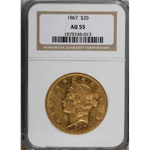 <B>1867 $20 AU55 NGC.</B></I> NGC Census: (35/204). PCGS Population (29/164). Mintage: 251,065. Numismedia Wsl. Price for NGC/PCGS coin in AU55: $1,450. (#8951)<BR><BR><B>Coin Engraver:</B> James B. Longacre<BR><BR><b>Shipping:</b> Coins & Currency (<a target="_blank" href="http://www.heritageauctions.com/common/shipping.php">view shipping information</a>)