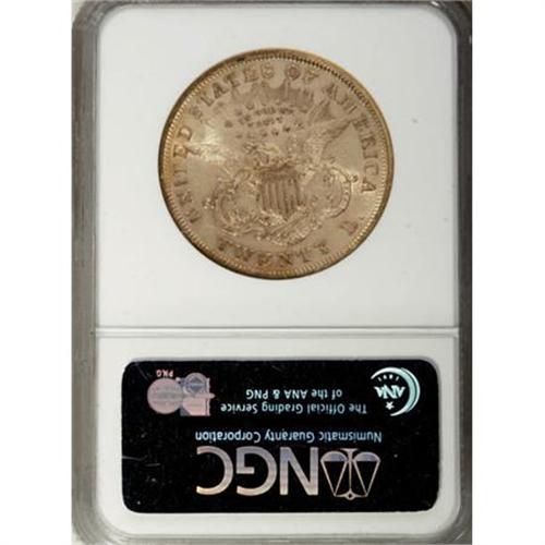 <B>1867 $20 AU55 NGC.</B></I> A flashy example with lots of luster and a pleasing, peach-gold color. The devices are well-struck and the surfaces are abraded in a manner that is not inconsistent with the grade.<BR><I>From The Wild West #1 NGC Registry of Type Three Double Eagles.</B></I><BR><BR><B>Coin Engraver:</B> James B. Longacre<BR><BR><b>Shipping:</b> Coins & Currency (<a target="_blank" href="http://www.heritageauctions.com/common/shipping.php">view shipping information</a>)