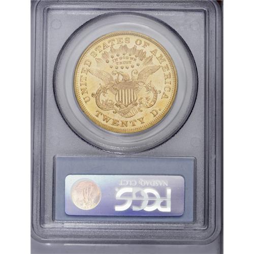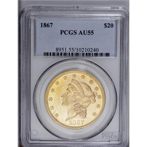 <B>1867<$20> AU55 PCGS.</B></I> Though lightly circulated with handling marks in the fields, this piece has reflective luster with moderate to shallow mirrors. The yellow-gold devices are well struck.
