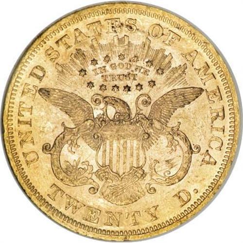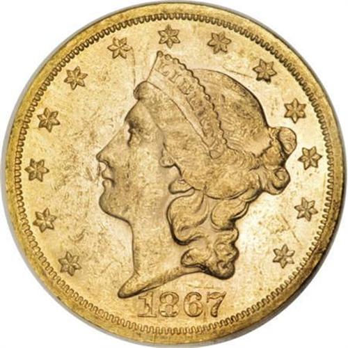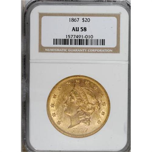 <B>1867 $20 AU58 NGC.</B></I> A frosty light yellow-gold representative of the Type Two design first coined in the previous year. A few minor surface marks are typical of these large gold coins. This date proves to be more plentiful than most Philadelphia Mint issues of the design, yet it is not easy to locate in AU or Mint State grades.<BR><BR><B>Coin Engraver:</B> James B. Longacre<BR><BR><b>Shipping:</b> Coins & Currency (<a target="_blank" href="http://www.heritageauctions.com/common/shipping.php">view shipping information</a>)