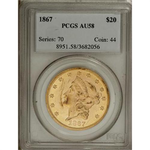 <B>1867 $20 AU58 PCGS.</B></I> This is a well struck double eagle that has extensive prooflike luster. The reverse is clean and would likely merit an Uncirculated grade on its own. The obverse also has scant indications of rub, although a couple of moderate abrasions are noted for accuracy. The central arrow shaft is completely absent, as made due to a lapped die. A scarce issue in all grades, most survivors are encountered in AU58 to MS61 grades. <BR><BR><B>Coin Engraver:</B> James B. Longacre<BR><BR><b>Shipping:</b> Coins & Currency (<a target="_blank" href="http://www.heritageauctions.com/common/shipping.php">view shipping information</a>)