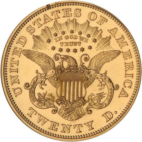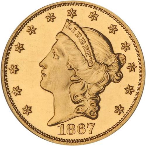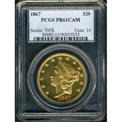 <b>1867 $20 Liberty. PCGS graded PF61 CAM.</b> Pop: 1/0. High date for the Proofs of 1867 with the 1 close to bust. Extra outline around device broken above 18. Extra outlines around inner points of all stars. Dentils mostly well apart except near date. Tiny dash just to right of eighth star. Reverse: No repunching on stars or TRUST. First vertical stripe has right line doubled and with an extra line (almost vertical) bulging a little at right top. Middle arrow shaft weak; lowest arrowhead touches scroll; wing barely touches E(D). Dentils mostly well apart except above NITED STATES OF.