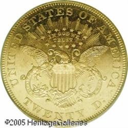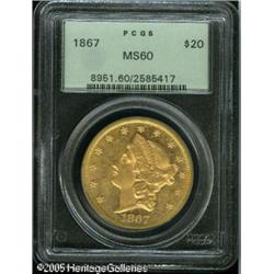 <B>1867 $20 MS60 PCGS.</B></I> A scarce date to find in any grade of Mint State and this one has ample appeal for the collector. Note the orange-gold color and reflective fields. Scattered handling marks and nicks as usually seen, but this coin is still attractive. Housed in an older green insert PCGS holder. Population: 22 in 60, 66 finer (1/05). Lot:9028