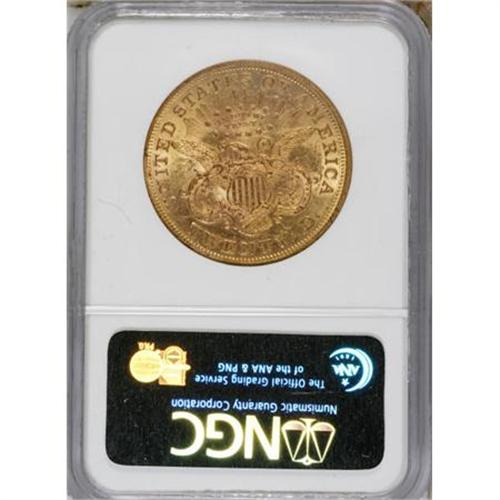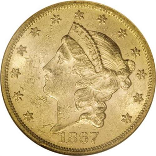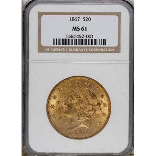 <B>1867 $20 MS61 NGC.</B></I> Since gold coins failed to circulate except on the West Coast in 1867, the mintage of 251,065 double eagles at Philadelphia was likely intended for export to Europe. Most of those pieces must have been eventually melted, given the scarcity of the 1867 in any grade. Between NGC and PCGS, only three pieces exceed the MS62 level, and those are certified MS63. This well struck and somewhat scuffy example has good luster and a single mentionable mark on the obverse rim at 7 o'clock.<BR><BR><b>Shipping:</b> Coins & Currency (<a target="_blank" href="http://www.heritageauctions.com/common/shipping.php">view shipping information</a>)