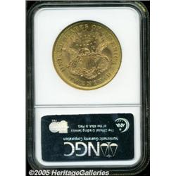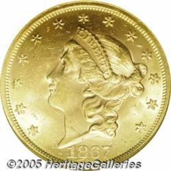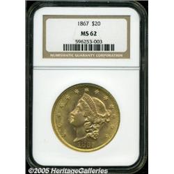 <B>1867 $20 MS62 NGC.</B></I> Although approximately a quarter million pieces were minted, only a tiny portion of the production has survived the smelter. Generally encountered in XF and AU grades and Mint State examples are considered rare. The present example is relatively clean for this usually bagmarked grade. The coin is sharply struck and has complete luster on both sides. There are traces of grease, as struck, in the areas surrounding the date. Population: 19 in 62, 6 finer (2/05).