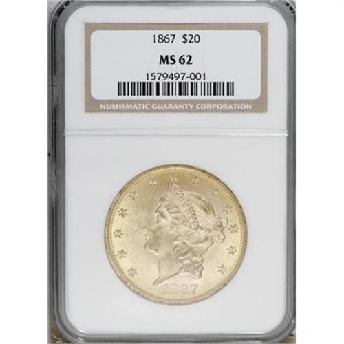 <B>1867 $20 MS62 NGC.</B></I> A highly lustrous representative of this conditionally rare early Type Two issue. Well struck, and consequential contact is limited to Liberty's chin and lower cheek. A subtle spot above the right (facing) wing will be missed by most observers. Census: 41 in 62, 2 finer (12/07).<BR><BR><B>Coin Engraver:</B> James B. Longacre<BR><BR><b>Shipping:</b> Coins & Currency (<a target="_blank" href="http://www.heritageauctions.com/common/shipping.php">view shipping information</a>)