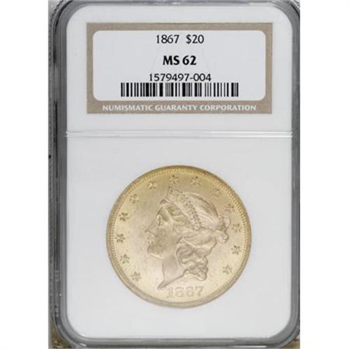 <B>1867 $20 MS62 NGC.</B></I> As with many 1867 twenties, this example displays attractive semiprooflike characteristics in the fields. Well struck details and limited abrasions qualify this piece as a bona fide Mint State survivor. Above the MS62 level, this issue becomes frightfully challenging to locate. Census: 41 in 62, 2 finer (12/07).<BR><BR><B>Coin Engraver:</B> James B. Longacre<BR><BR><b>Shipping:</b> Coins & Currency (<a target="_blank" href="http://www.heritageauctions.com/common/shipping.php">view shipping information</a>)