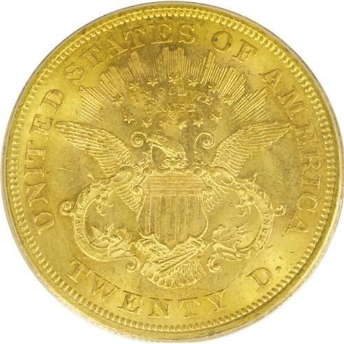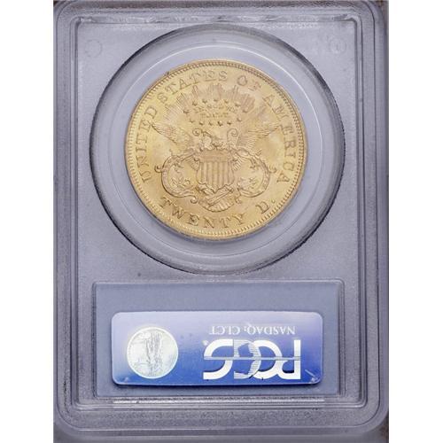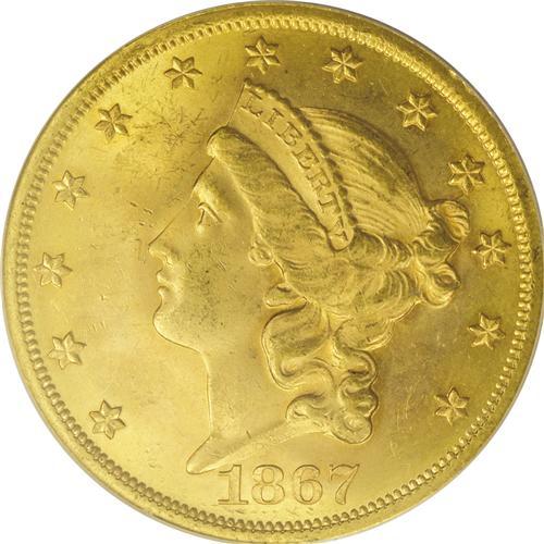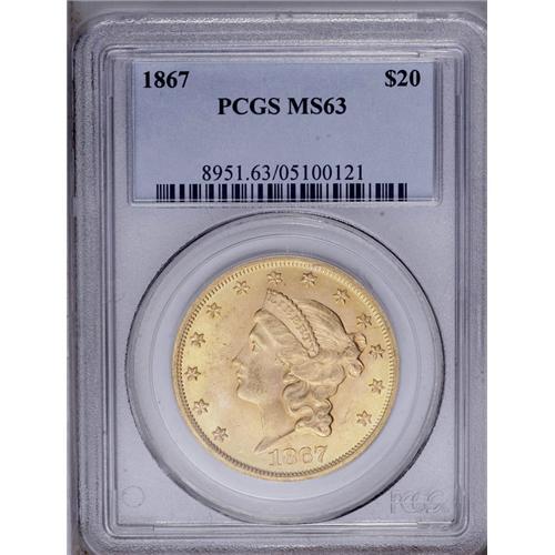 <B>1867<$20> MS63 PCGS.</B></I> The 1867 issue is one of the few early dates among Type Two (With Motto) double eagles that can occasionally be found in Mint State. This example is sharply struck for the issue, with superlative glowing mint frost and only the slightest abrasions on either side. Interestingly, the same date logotype punch used for this issue was also employed on the 1867 Liberty Seated silver dollars, according to Bowers' double eagle reference. The surfaces are an attractive two-toned ensemble, with yellow-orange centers that cede to greenish-gold at the borders. This piece is also the single finest-graded 1867 double eagle at PCGS. NGC has certified two coins at MS63, with none finer (7/06). The Bass Collection coin, for reference, was an MS61 example.