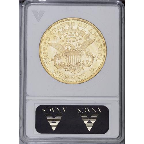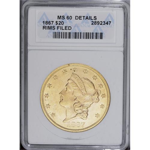 <B>1867<$20>--Rims Filed--ANACS. MS60 Details.</B></I> Booming luster dazzles the eye, although the apricot-gold fields are typically abraded. The rim is lightly filed, a feature most apparent on the upper left reverse.