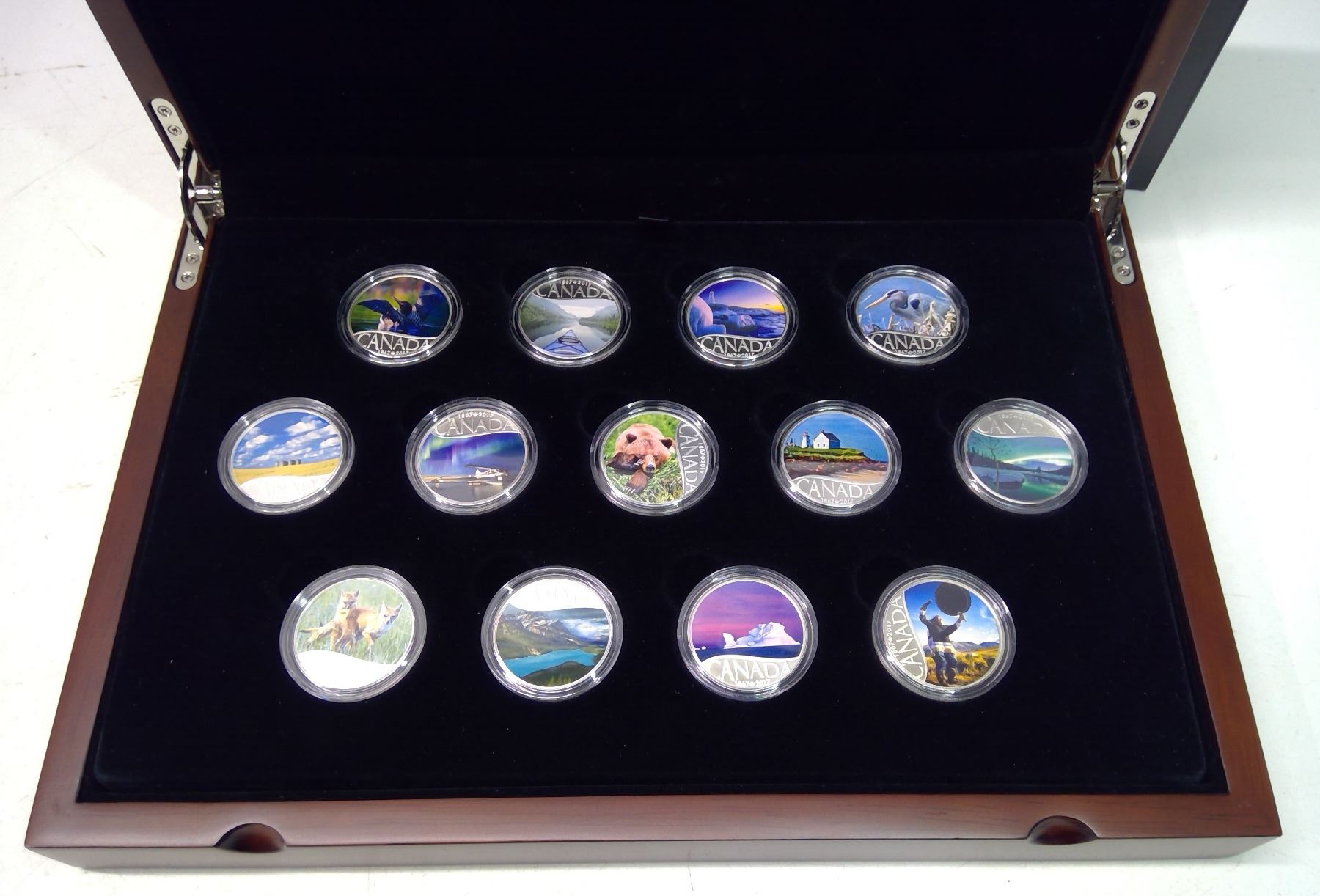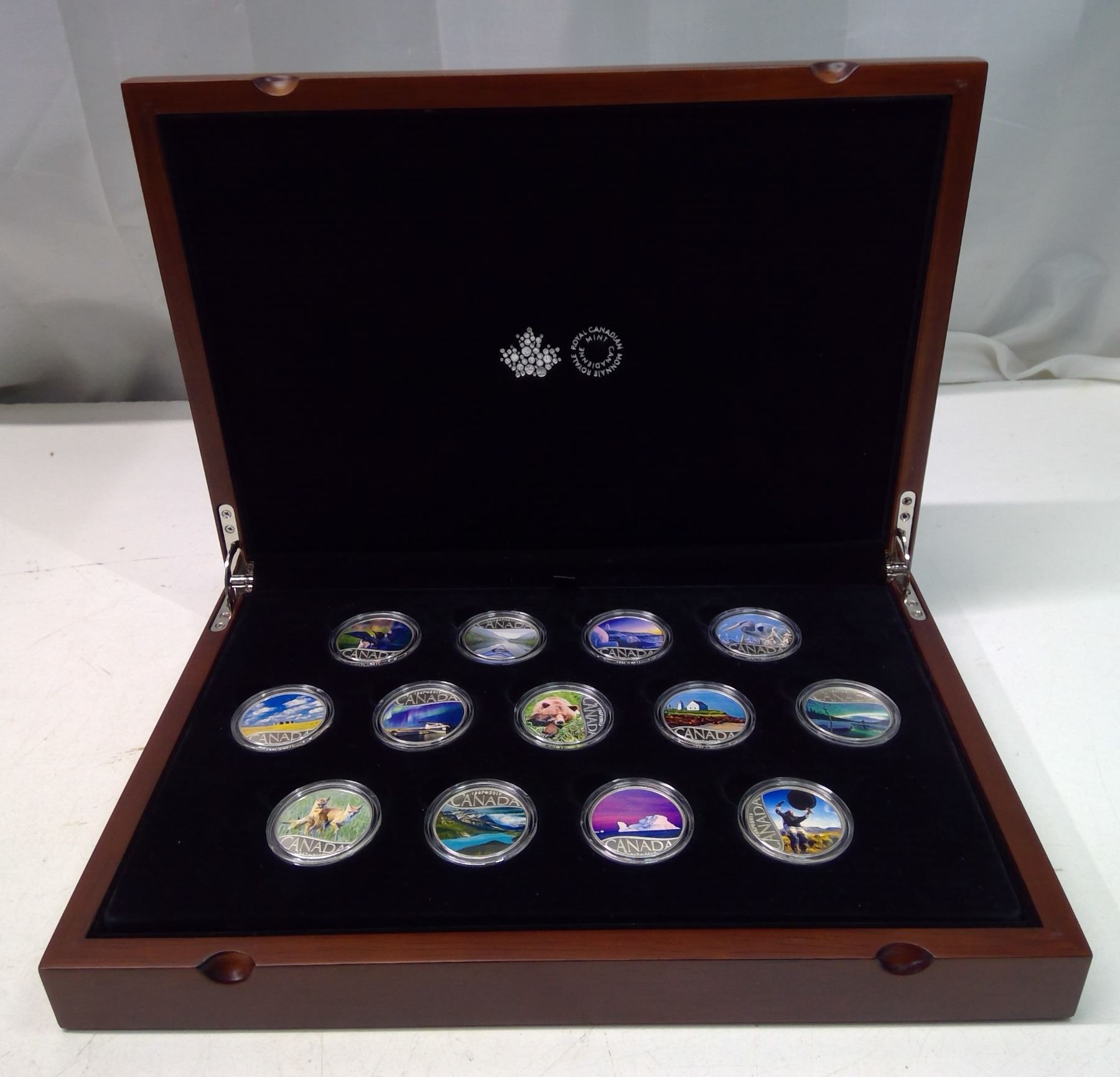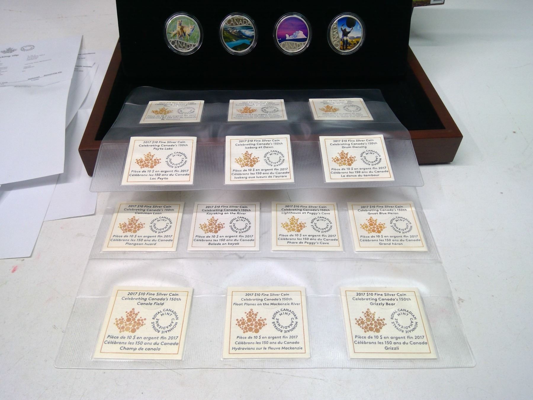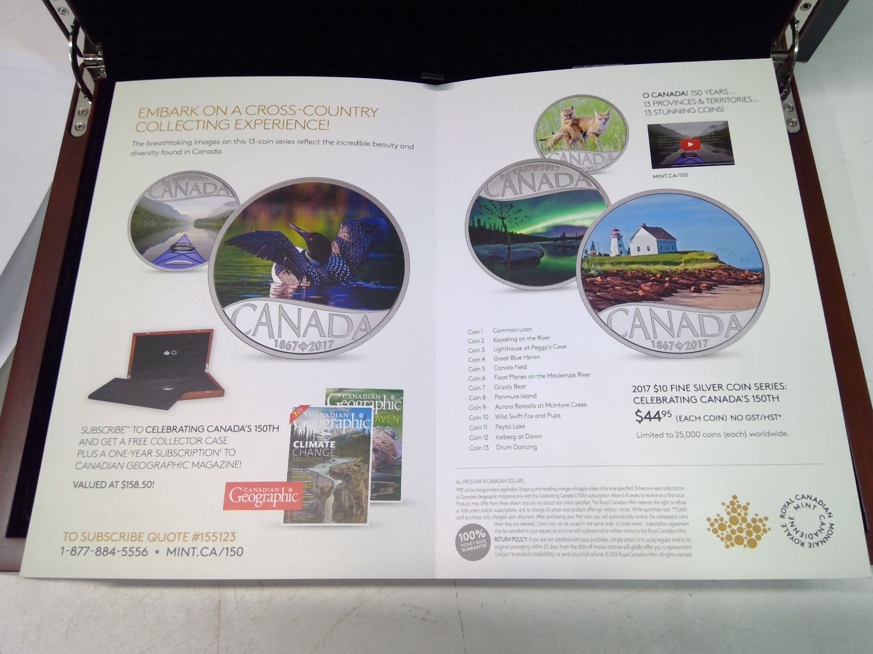 1867 – 2017 Complete set of 13 Canadian $10 coins, each celebrating Canada’s 150th Anniversary. Includes Loon, Kayaking on the river, Lighthouse at Peggy’s Cove, Great Blue Heron, Canola Field, Float Planes, Grizzly Bear, Panmure Island, Aurora Borealis, Swift Fox, Peyto Lake, Iceberg & Drum Dancing. All are 99.99% pure Silver & Colourized. Proof with Ultra Heavy Cameo. Housed in its original Royal Canadian Mint wooden case & box of issue. Includes Certificate of Authenticity. Scarce.