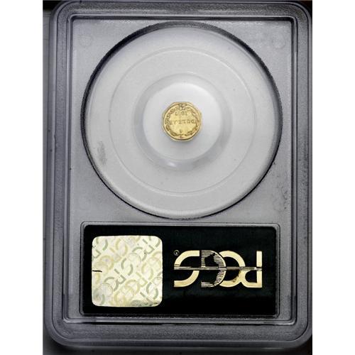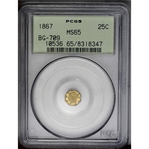 <B>1867<25C> Liberty Octagonal 25 Cents, BG-709, R.4, MS65 PCGS.</B></I> This attractive older holder apricot-gold Gem is crisply impressed, and is essentially pristine aside from a single nearly imperceptible horizontal graze above DOLLAR.