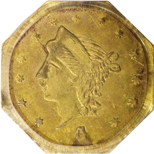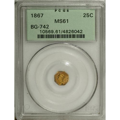 <B>1867 25C Liberty Octagonal 25 Cents, BG-742, Low R.7, MS61 PCGS.</B></I> An apricot-gold representative of this rare variety. A mildly prooflike example with a few faint field marks. A "ghost" from the high relief forehead curl of the portrait weakens the 1 in the date, as mentioned in the Breen-Gillio second edition. Encapsulated in a green label holder.<BR><BR><b>Shipping:</b> Coins & Currency (<a target="_blank" href="http://www.heritageauctions.com/common/shipping.php">view shipping information</a>)
