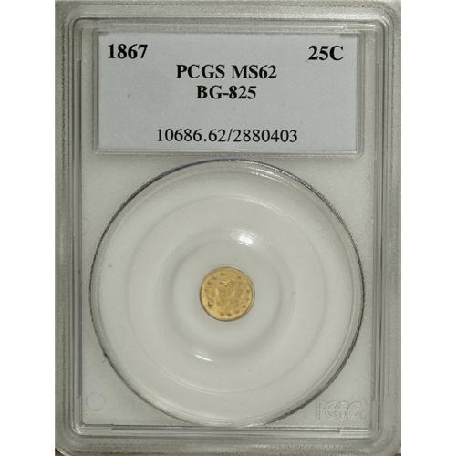 <B>1867 25C Liberty Round 25 Cents, BG-825, R.4, MS62 PCGS.</B></I> PCGS Population (29/15). NGC Census: (4/0). (#10686)<BR><BR><b>Shipping:</b> Coins & Currency (<a target="_blank" href="http://www.heritageauctions.com/common/shipping.php">view shipping information</a>)