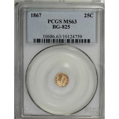 <B>1867 25C Liberty Round 25 Cents, BG-825, R.4, MS63 PCGS.</B></I> . PCGS Population (13/2). NGC Census: (0/1). (#10686)<BR><BR><b>Shipping:</b> Coins & Currency (<a target="_blank" href="http://www.heritageauctions.com/common/shipping.php">view shipping information</a>)