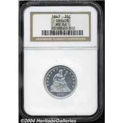 <table><tr><td><table><tr><td>1867 25C MS62 NGC. This is a sharply struck example whose surfaces are brilliant and untoned on either side. The fields are semi-prooflike with a few abrasions scattered about that account for the grade. Scarce as only 20,000 pieces were coined.Ex: Walter H. Childs Collection (Bowers and Merena, 8/1999), lot 270. <BR><BR><B>Important notice:</B> Heritage usually auctions material at the rate of 200-250 lots per hour. On some occasions eBay Live bid software or the Internet may not be able to keep up with the pace of the auction. We recommend placing a realistic absentee bid now as insurance to avoid disappointment. Occasionally the auctioneer may eliminate or reject an eBay Live bid, and the auctioneer may also reopen a lot after the close of the eBay live bidding (usually because we missed an audience bid), and may reject your bid even if it shows you as the winning bidder. By bidding via eBay Live, you agree that Heritage may award the lot to another bidder at its sole discretion under the circumstances described above or any other reasonable circumstances. Since eBay bids are not shown to us until we open the lot on the floor, we treat those bids just like floor bids. In most cases the floor responds before the eBay bid is presented to us, due to Internet lag time, so for consistency we have made it a policy that floor bids are always considered first over tie eBay live bids. Also please note that all Heritage lots purchased through eBay Live carry a 20% Buyer's Premium. Please make sure you read the Terms and Conditions before you bid. <BR><BR><B>IMPORTANT ANNOUNCEMENT ABOUT RESERVES:</B> Heritage now divulges all reserves on its web site 7 days before every auction. If you want to know whether the reserve on this lot has been met, and if not, what the reserve amount is, please visit this lot page on the HeritageCoin.com web site, or email: bid@HeritageGalleries.com </span></font></td></tr></table></td></tr></table>
