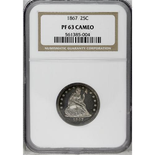 <B>1867<25C> PR63 Cameo NGC.</B></I> A fully brilliant Cameo proof with bright silver color at the centers, surrounded by a frame of gold, sky blue, and gunmetal blue toning.