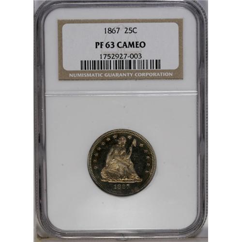 <B>1867<25C> PR63 Cameo NGC.</B></I> Blushes of honey-gold, forest-green, and ruby patina grace this flashy and needle-sharp quarter. Minor obverse field marks are unobtrusive for the grade. A scant 625 proofs were coined. Census: 6 in 63 Cameo, 13 finer (6/06).