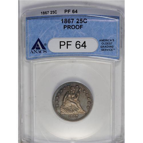<B>1867<25C> PR64 ANACS.</B></I> Choice with deeply mirrored fields that glitter beneath champagne and blue-violet toning. Faint hairlines are noted in the right obverse field.<BR><I>Ex: Stack's, 7/52, lot 445.</B></I><BR><I>From The Redfjord Collection.</B></I>