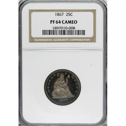 <B>1867 25C PR64 Cameo NGC.</B></I> Cobalt-blue, magenta, lavender, and golden-tan patination runs over both sides of this lovely near-Gem. Both sides exhibit outstanding Cameo contrast and razor-sharp devices. A few trivial handling marks define the grade. Census: 8 in 64 Cameo, 11 finer (6/07).<BR><BR><b>Shipping:</b> Coins & Currency (<a target="_blank" href="http://www.heritageauctions.com/common/shipping.php">view shipping information</a>)