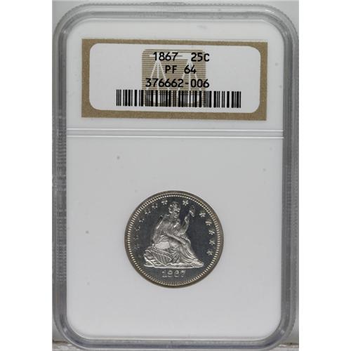 1867 25C PR64 NGC. Both major motifs are frosty, altho