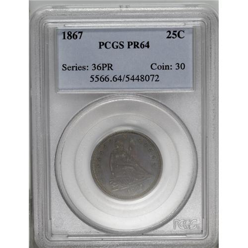 1867 25C PR64 PCGS. Deep electric-blue toning dominate 1867[25C] PR64 PCGS.