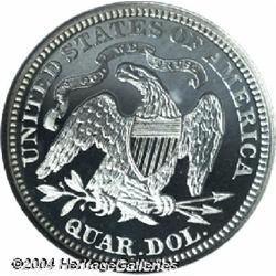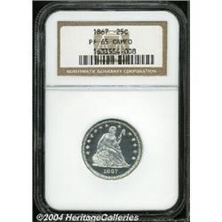 <B>1867<25C> PR65 Cameo NGC.</B></I> This is a breathtaking Gem. Both sides are devoid of even the lightest toning. There are no bothersome hairlines or contact marks, and the strike is expectantly full for a proof. The cameo contrast is bold, and one may be tempted to ask NGC why this coin did not receive an Ultra Cameo designation. One of only 625 proof Seated Quarters produced at the Philadelphia Mint in 1867. In addition, a mere 20,000 commercial strikes were coined. Identifiable by two tiny planchet flaws (as struck) in the obverse field behind Liberty's head. Not surprisingly, very few examples have received the Cameo designation, from either service, and only a handful of those have qualified at or above the PR65 grade level. <BR><BR><B>Important notice:</B> Heritage usually auctions material at the rate of 200-250 lots per hour. On some occasions eBay Live bid software or the Internet may not be able to keep up with the pace of the auction. We recommend placing a realistic absentee bid now as insurance to avoid disappointment. Occasionally the auctioneer may eliminate or reject an eBay Live bid, and the auctioneer may also reopen a lot after the close of the eBay live bidding (usually because we missed an audience bid), and may reject your bid even if it shows you as the winning bidder. By bidding via eBay Live, you agree that Heritage may award the lot to another bidder at its sole discretion under the circumstances described above or any other reasonable circumstances. Since eBay bids are not shown to us until we open the lot on the floor, we treat those bids just like floor bids. In most cases the floor responds before the eBay bid is presented to us, due to Internet lag time, so for consistency we have made it a policy that floor bids are always considered first over tie eBay live bids. Also please note that all Heritage lots purchased through eBay Live carry a 20% Buyer's Premium. Please make sure you read the Terms and Conditions before you bid.