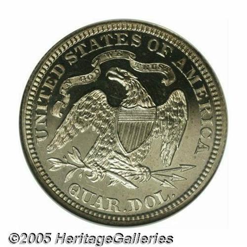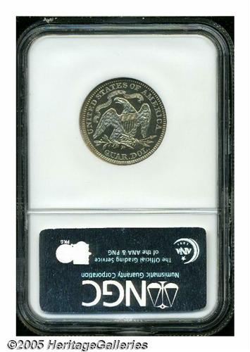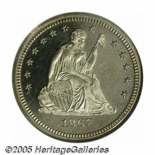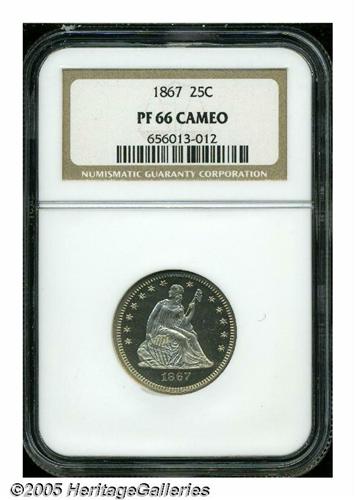 <B>1867<25C> PR66 Cameo NGC.</B></I> This Premium Gem Proof has exceptional contrast with extremely deep mirrors on both sides. It is an essentially brilliant example with just a hint of champagne toning on each side. Although the With Motto Seated Quarters are relatively plentiful as a type, Proofs from the 1860s are substantially rarer than those struck two decades later. This example is among the finer coins of its date to be certified. Population: 2 in PR66 Cameo, 1 finer (5/05).