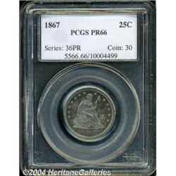 <B>1867<25C> PR66 PCGS.</B></I> The importance of proofs from this year (625 pieces) is magnified by the absolute rarity of business strikes, of which only 16,000 pieces were produced. This lovely example features beautiful cobalt-blue toning, interspersed with small splashes of pale-purple, over both the obverse and reverse. The fields offer a high degree of reflectivity, highlighting the superbly struck design elements. No significant blemishes are apparent on the relatively pristine surfaces. Population: 4 in 66, 1 finer (3/04).<BR><I>From the JFS Collection.</B></I> <BR><BR><B>Important notice:</B> Heritage usually auctions material at the rate of 200-250 lots per hour. On some occasions eBay Live bid software or the Internet may not be able to keep up with the pace of the auction. We recommend placing a realistic absentee bid now as insurance to avoid disappointment. Occasionally the auctioneer may eliminate or reject an eBay Live bid, and the auctioneer may also reopen a lot after the close of the eBay live bidding (usually because we missed an audience bid), and may reject your bid even if it shows you as the winning bidder. By bidding via eBay Live, you agree that Heritage may award the lot to another bidder at its sole discretion under the circumstances described above or any other reasonable circumstances. Since eBay bids are not shown to us until we open the lot on the floor, we treat those bids just like floor bids. In most cases the floor responds before the eBay bid is presented to us, due to Internet lag time, so for consistency we have made it a policy that floor bids are always considered first over tie eBay live bids. Also please note that all Heritage lots purchased through eBay Live carry a 20% Buyer's Premium. Please make sure you read the Terms and Conditions before you bid. </span></font></tr></table></td></tr></table>