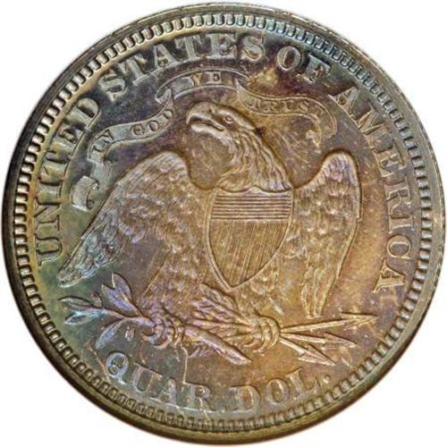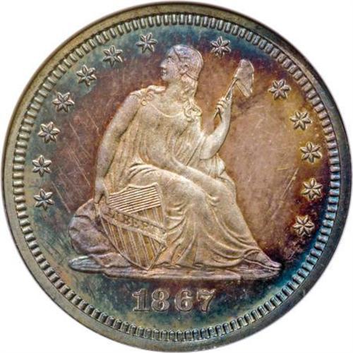 <B>1867 25C PR67 </B></I> S<B> NGC.</B></I> This is a visually stunning Superb Gem that combines exquisite surface preservation, crisply struck design elements, and gorgeous toning. Few Seated quarters survive today with such an impressive array of technical and visual attributes. A truly wondrous coin that must be one of the finest survivors from an original mintage of 625 pieces. <BR><BR><B>Coin Engraver:</B> Christian Gobrecht<BR><BR><b>Shipping:</b> Coins & Currency (<a target="_blank" href="http://www.heritageauctions.com/common/shipping.php">view shipping information</a>)