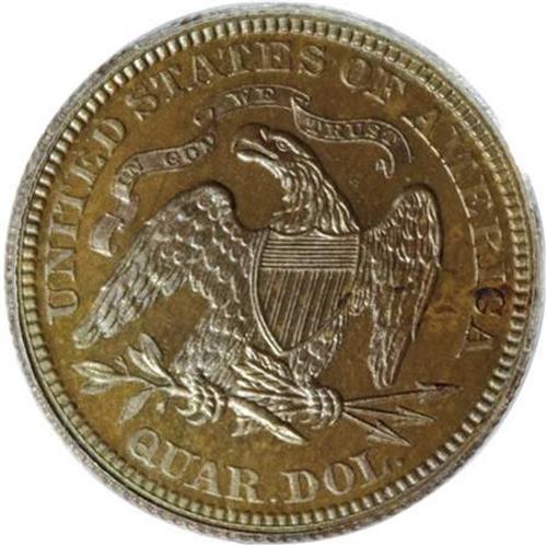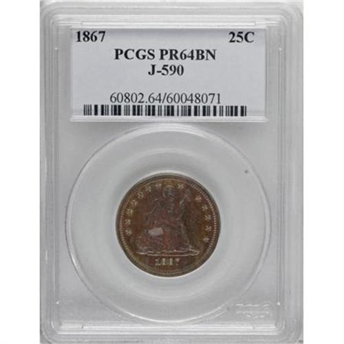 <B>1867 25C Quarter Dollar, Judd-590, Pollock-654, High R.7, PR64 Brown PCGS.</B></I> Struck from regular issue dies with a reeded edge, but in copper alloy. The obverse is cherry-red with glimpses of cobalt-blue, while the reverse is rose-red, olive-gold, and ocean-blue. A fully struck and unmarked near-Gem with minor gray debris near the date.<BR><BR><b>Shipping:</b> Coins & Currency (<a target="_blank" href="http://www.heritageauctions.com/common/shipping.php">view shipping information</a>)