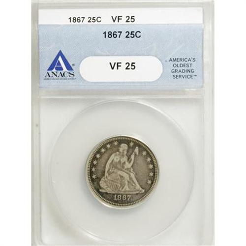 <B>1867 25C VF25 ANACS.</B></I> NGC Census: (0/14). PCGS Population (2/28). Mintage: 20,000. Numismedia Wsl. Price for NGC/PCGS coin in VF25: $358. (#5470)<BR><BR><B>Coin Engraver:</B> Christian Gobrecht<BR><BR><b>Shipping:</b> Coins & Currency (<a target="_blank" href="http://www.heritageauctions.com/common/shipping.php">view shipping information</a>)