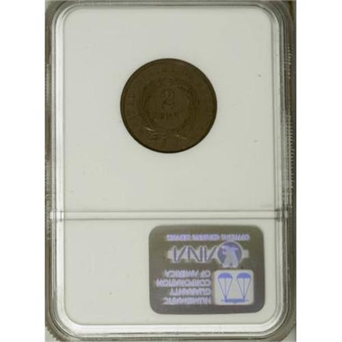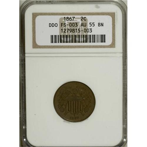 <B>1867 2C Doubled Die Obverse AU55 NGC.</B></I> FS-101, formerly FS-003. The pickup point for the wide die doubling is IN GOD WE TRUST, although nearby design elements are also doubled. A briefly circulated chocolate-brown representative that has an attractive appearance.<BR><BR><b>Shipping:</b> Coins & Currency (<a target="_blank" href="http://www.heritageauctions.com/common/shipping.php">view shipping information</a>)