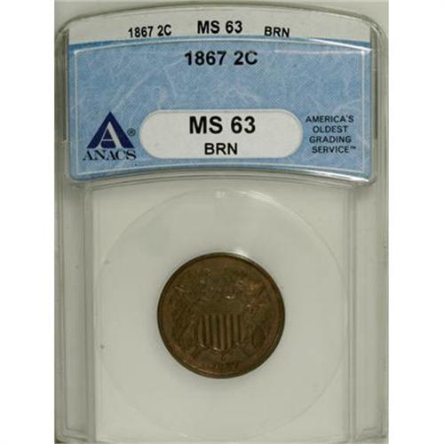 <B>1867 2C MS63 Brown ANACS.</B></I> NGC Census: (39/74). PCGS Population (44/25). Mintage: 2,938,750. Numismedia Wsl. Price for NGC/PCGS coin in MS63: $129. (#3591)<BR><BR><B>Coin Engraver:</B> James B. Longacre<BR><BR><b>Shipping:</b> Coins & Currency (<a target="_blank" href="http://www.heritageauctions.com/common/shipping.php">view shipping information</a>\)