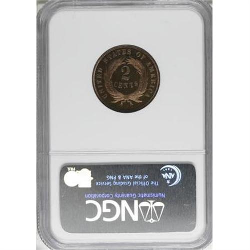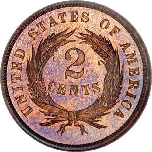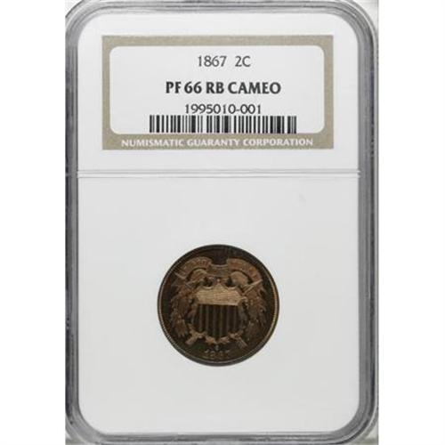 <B>1867 2C PR66 Red and Brown Cameo NGC.</B></I> Orange-gold dominates despite variegated violet tints on the lower obverse and throughout the reverse field. This fully struck Gem displays flashy fields, and has only two tiny spots near 12 o'clock. From an original mintage of 625 pieces, only five coins have been certified with Cameo or Ultra Cameo surfaces, by NGC (11/07).<BR><BR><b>Shipping:</b> Coins & Currency (<a target="_blank" href="http://www.heritageauctions.com/common/shipping.php">view shipping information</a>)