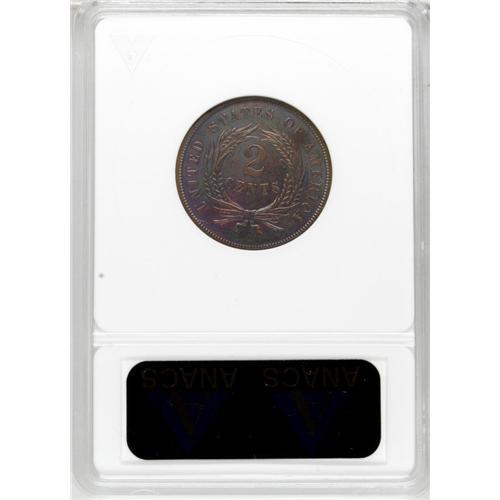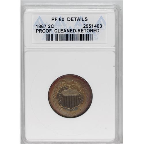 <B>1867 2C --Cleaned--Retoned--ANACS. PR60 Details.</B></I> Unquestionably a proof striking, but the dubious color is olive-green in the shield center, transitioning too sharply to tan-gold near the rims, with a dollop of magenta on the upper border. The reverse is a wild melange of blue-green and magenta. The luster is nonexistent, a victim of the processing.<BR><I>Ex: Stack's 71st Anniversary Sale (10/2006), lot 2592.</B></I><BR><BR><b>Shipping:</b> Coins & Currency (<a target="_blank" href="http://www.heritageauctions.com/common/shipping.php">view shipping information</a>)