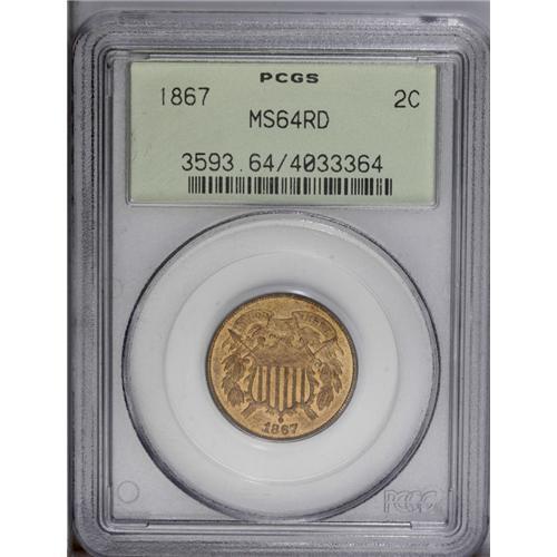<B>1867<2C> MS64 Red PCGS.</B></I> Boldly struck with vivid orange-copper surfaces. The reverse has begun to turn inside the wreath of this near-Gem. Population: 31 in 64 Red, 20 finer (8/06).