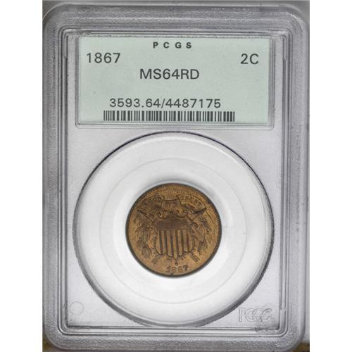 <B>1867<2C> MS64 Red PCGS.</B></I> Lovely golden-tan coloration adorns the lustrous surfaces. The design elements are consistently well defined throughout, and distracting marks are absent. Housed in an earlier PCGS holder with a light-green label. Population: 31 in 64, 20 finer (6/06).