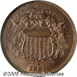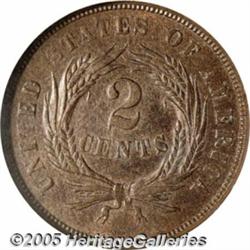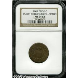 <B>1867 2C MS64 Red and Brown NGC.</B></I> Doubled Die Obverse. FS-003. Richmond Collection. While not an especially rare Doubled Die, except in mint condition, because of the pronounced shift in the letters in the scroll interest is quite high in this coin. This is a well struck example that shows a speckled overlay of brown patina on each side, just enough to significantly subdue the original red luster.